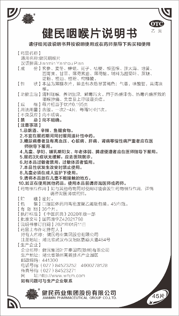 玄参、麦冬、蝉蜕、诃子、桔梗、板蓝根、胖大海、地黄、西青果、甘草、薄荷素油、薄荷脑。辅料为甜菊叶、蔗糖、淀粉、橙油、橙粉、枸橼酸。